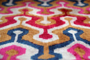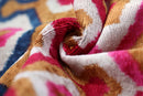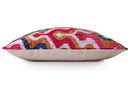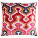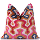 Elevate your living space with bold color and texture through the Handmade Geometric Velvet Pillow, sized at 20x20 inches (50x50 cm). This cushion features a dynamic, repeating geometric motif in vibrant fuchsia, rich navy, earthy gold, and soft ivory—woven into lush silk velvet by master artisans in Turkey and Uzbekistan.