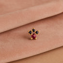 Embodying charm and elegance, this nose pin features a rich red CZ stone at the base crowned by a trio of deep blue CZs. Set in solid 925 sterling silver with a radiant gold polish, the dainty cluster mimics a miniature royal crown. Perfect for weddings, festivals, or statement ethnic styling.