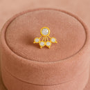 This refined gold-plated nose pin showcases a brilliant bezel-set white CZ at the center, complemented by five sparkling CZ accents arranged in a structured fan layout. The clean, symmetrical design reflects grace and sophistication, making it ideal for bridal wear, cultural celebrations, or elegant daily styling.