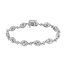 Let yourself be dazzled by this genuine .925 sterling silver link bracelet that showcases 2 1/2ct TDW of diamonds. 198 round cut diamonds glisten in this stunning design. A miracle set round cut diamond sits at the heart of each diamond inlaid almond shaped link. Each of these links connects to the next by a single miracle set diamonds. A box with clasp mechanism keeps the bracelet secure.