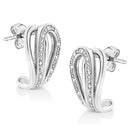 Make her stand out with these unique horseshoe diamond earrings. Fashioned in lustrous sterling silver these intricately designed earrings showcases two curved lines, one smooth sterling silver and the other sterling silver studded with 22 pave set single cut diamonds, placed over one another to form a delightful earrings. These gorgeous pair closes with a secure omega clasp. Total diamond weight is 1/10 ctw.