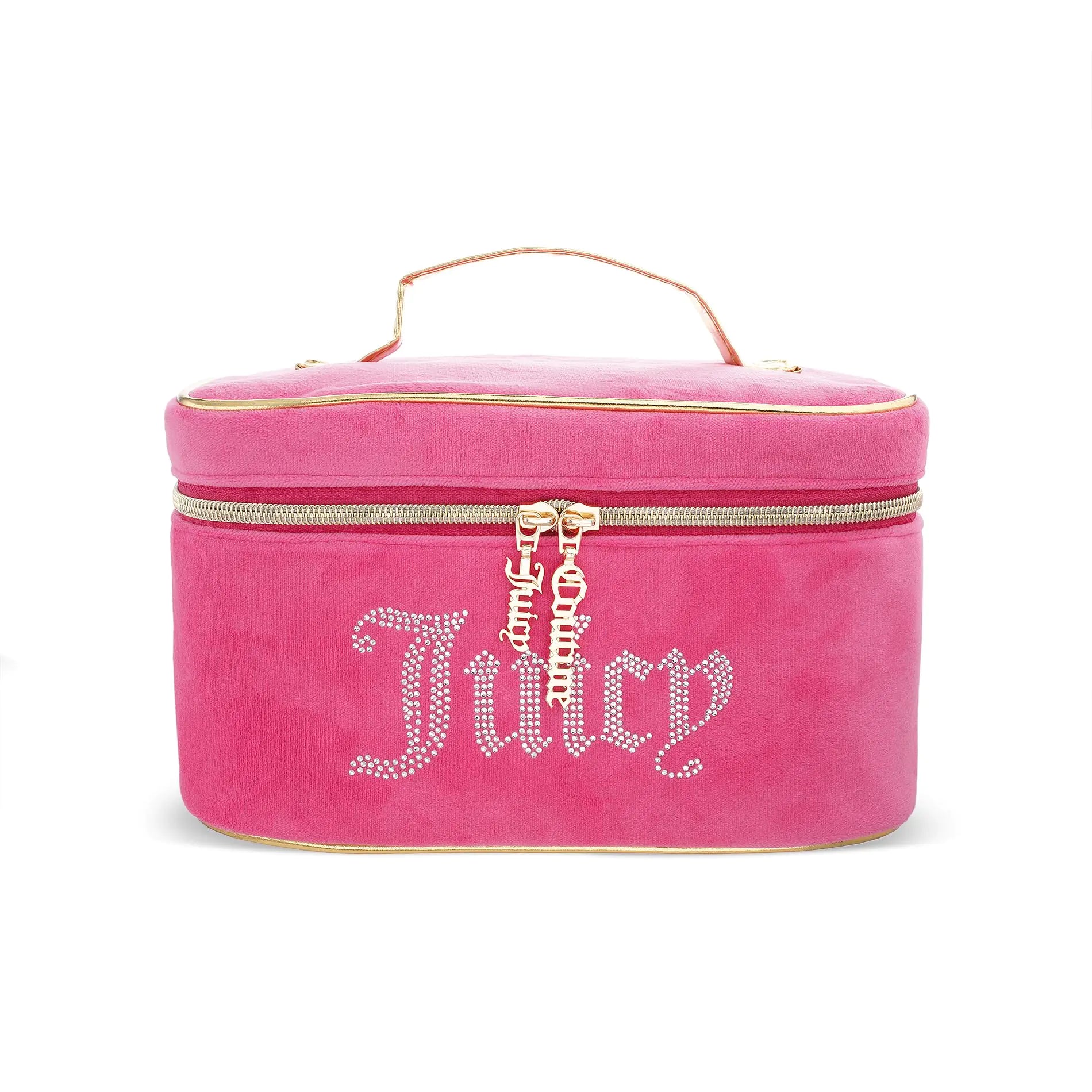 ["OFFICIALLY LICENSED JUICY COUTURE: Women Travel Train Case; Built with a careful unique approach Juicy Couture offers premium appparel accessories and more" HIGH QUALITY: The Juicy Couture Cosmetics Train Case Makeup Bag is made of durable fabric with accented zipper pulls; Ideal as a toiletries kit with statement-making prints patterns and styles; No matter your style Juicy Couture has a cosmetics bag for you individual style ORGANIZE: Our makeup and toiletries travel train case is ideal to stay organized on all your vacations overnights business trips and get-a-ways; Toiletries kit with compartments for organizng your skin care products makeup accessories toothbrush hair brushes and all the essentials you need to get out the door or get ready for bed WIPE CLEAN LINING: Easy clean travel wristlet means no worries about leaks or spills; Convenient water resistant toiletries bag for women; TSA Approved Travel Sized re-usable bottle included EASY GRAB HANDLE: Take your toiletry bag train case anywhere with the portable and convenient grab handle. Ideal overnight travel makeup bag for trips gym showers or office makeup essentials; SIZE: 9.5 x 5.25 x 6]