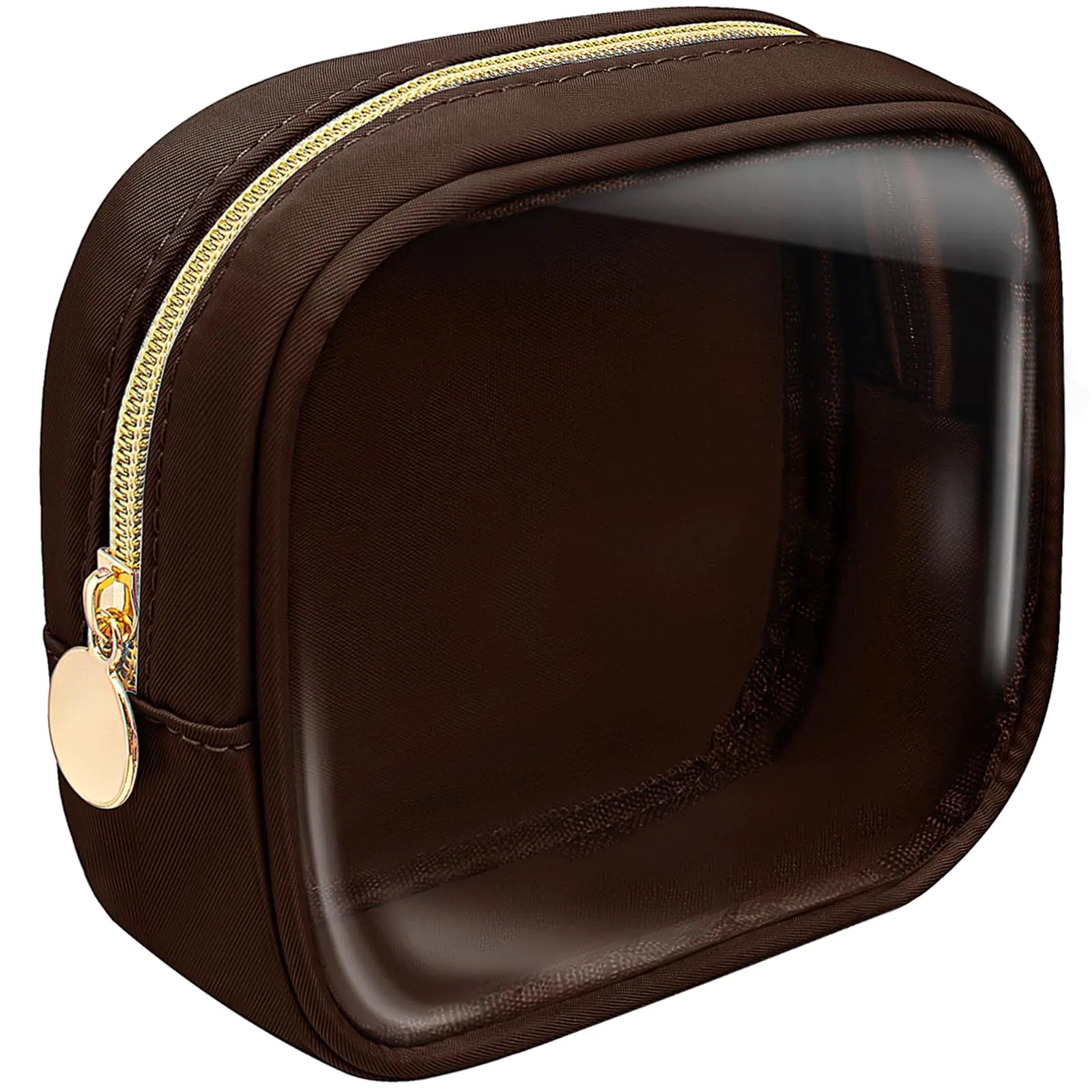 [🌎【Premium Materials】The small makeup bag is made of high-quality polyester fabric stain-resistant and easy to clean very lightweight and waterproof and perfect for storing cosmetics.The bag is accented with a stylish gold zipper adding a touch of elegance to its design. ✈️【【Perfect Size and Large Capacity】】The size of the clear cosmetic bag is 5.2" x 5" x 2"inches which can hold mobile phones lipstickwallets data cables cosmetics etc. Perfect for organizing your backpack or purses. Available in mini small sizes.The small size is perfect for everyday use and shorter journeys providing sufficient storage while remaining portable. The mini size is designed for maximum portability allowing you to carry just the essentials on the go. 💎 【Transparent Design for Quick Access】The clear small makeup pouch with transparent window everything will be clear at a glance.TSA Approved Toiletry bag for travel. ✨【Easy to Carry】makeup bag in a suitable size and a reasonable capacity it can meet your daily needs for storing eyebrows lipstick cushion cream eyeliner blush and foundation. 🌈【Multiple Color Options for Daily and Travel Use】 To cater to individual preferences and style our clear makeup travel bag is available in a variety of colors like Beigepinkwhitepurplebluecoffee.you can choose different color organzier your lifesee goodbye your boring life. 🌴Practical Bag: This summer beach style clear bag can not only be used as a makeup bag for daily use but also as a shopping pouch beach survival kit travel organizer toiletry bag etc. It can perfectly hold the makeup and daily item you need every day such as sunglasses sunscreen olive oil lipstick eye shadow rouge phone key etc.]