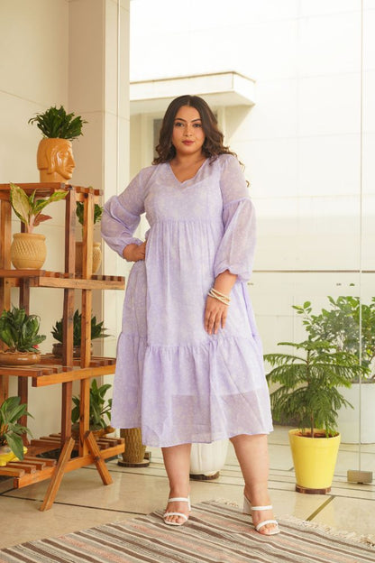 | It's a V-neck perfect summer dress which has everything that makes it a must-have piece for a lunch date. Made of Georgette fabric in lilac color, it's a calf-length printed tier dress featuring V-neck and elegant statement sleeves. Step out, teaming it with a pair of stilettos or ballad flats. |